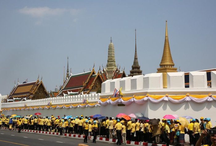 身着黄色衣服的民众们早已聚集在曼谷老城,准备欣赏泰王及皇家队伍的游行。