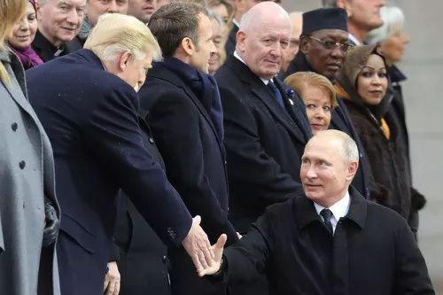 2018年11月11日,在法国首都巴黎,前来参加第一次世界大战结束一百周年纪念仪式的俄罗斯总统普京(右下)与美国总统特朗普握手。新华社/法新