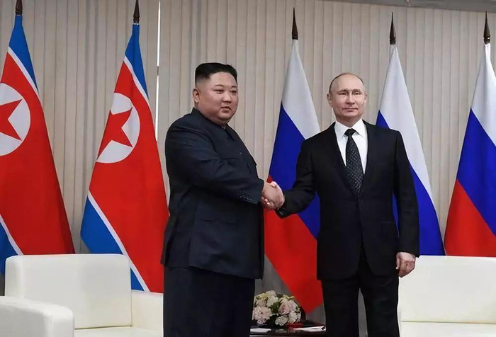 4月25日,在俄罗斯符拉迪沃斯托克,俄罗斯总统普京(右)与朝鲜最高领导人金正恩握手。新华社/卫星社