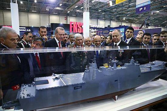 图:埃尔多安观看TCG两栖攻击舰设计方案的模型