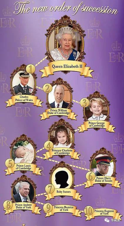 这个孩子将是英国王室的第七顺位继承人。排在查尔斯王子、威廉王子、乔治小王子、夏洛特小公主、路易小王子、哈里王子之后。但孩子不会拥有“王子”的称号,除非女王特许。