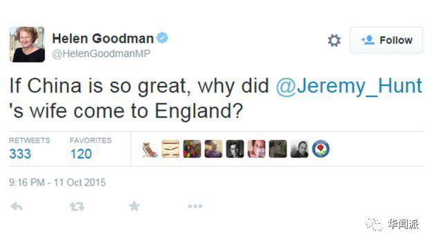 随后,英格兰东北部毕晓普奥克兰(Bishop Auckland)的工党议员Helen Goodman因为这番话而在推特上酸亨特称:“如果中国那么好,那么杰里米·亨特的妻子为什么要到英格兰来呢?”