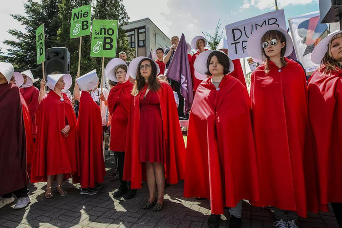 2017年,川普访问波兰之际,当地女性身着《侍女的故事》 制服抗议。(Credit Image: © Michal Fludra/NurPhoto via ZUMA Press)