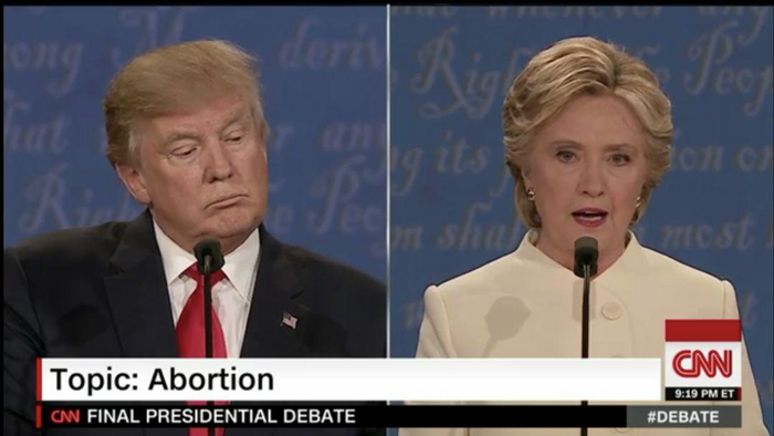 2016年大选第三次候选人辩论,民主党候选人希拉里警告川普上台,女性可能失去堕胎权。(CNN截屏)