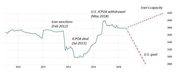 2018年5月,特朗普让美国退出了《联合全面行动计划》,并承诺要在2018年11月之前实施第二轮美国制裁。制裁的恢复让伊朗经济陷入了温和衰退,因为大公司不想冒被美国惩罚的风险,纷纷退出了伊朗经济。伊朗的石油出口急剧减少,货币大幅贬值。