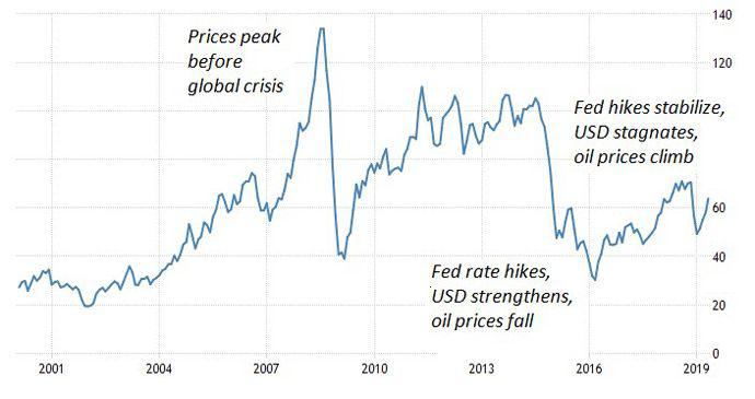 从经济上说,对任何主要石油出口国的制裁,都会削减全球石油总产量,并提高原油价格。2008年全球金融危机爆发前,石油价格飙升至每桶150美元。在暴跌到40美元之后,2010年初油价回升到100美元。由于美联储加息导致美元硬挺,仍然以美元计价的石油价格一度下跌到20多美元。从那时以后,美联储加息恢复正常,美元企稳,从而支持了油价的回升(表5)。