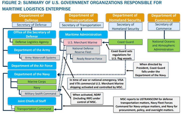 (编者注:此处的国家级舰队指的是包括美国海军、海岸警卫队、由MARAD管理的美国商船以及其它由国家海洋和大气管理局、美国陆军、各类美国政府或民间海事机构管理的各类船只。美国商船可在战争或国家紧急状态下,充当辅助运输工具,运送武装部队所需的物资。)