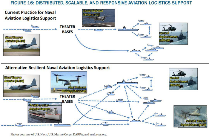1、向分布式航空后勤保障过渡,特别是通过更多使用CMV-22B(编者注:该型为海军MV-22鱼鹰的货运版);