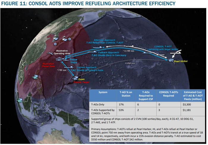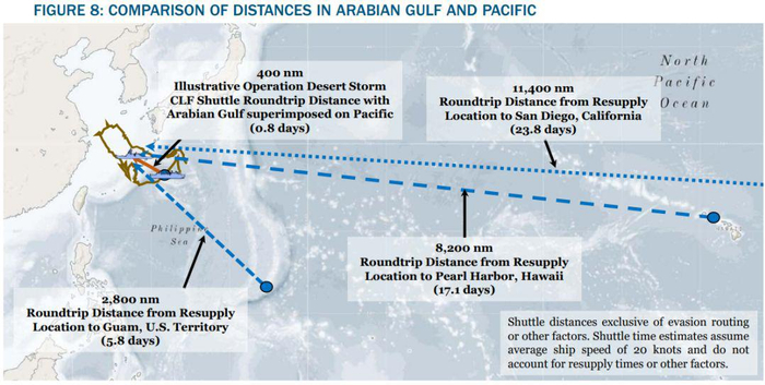 如果中美发生冲突,预计海军的前沿作战舰队每天会消耗超过15万桶的F-76型海军燃油和JP-5型航空燃油,如果战争持续一个月,则消耗450万桶以上,相当于现在14艘油轮的装载量;舰队每天通过通垂发射360枚导弹,一个月就会超过10800枚,这将是2003年伊拉克战争时期的战斧巡航导弹数量的13倍(编者注:当时美国海军发射了802枚战斧);另外还有每月1万吨的其它军需品和消耗品。如以中速航行运送上述这些物资,从珍珠港到西太平洋4000海里的航程将需要10天,到印度洋中部则要21天。