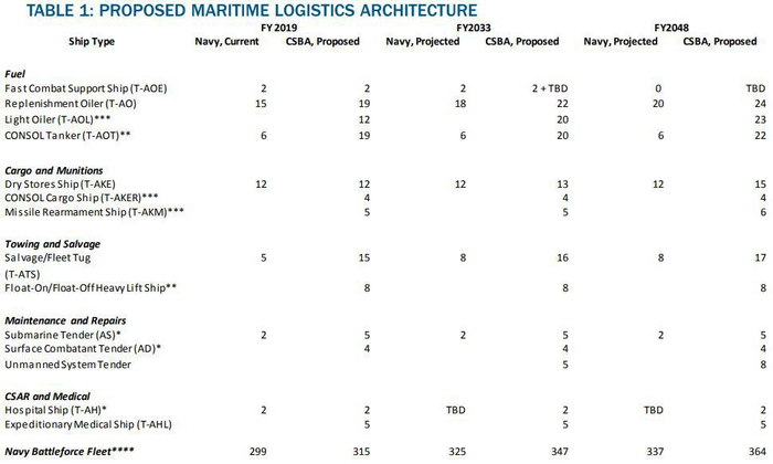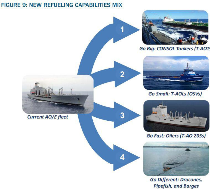 1.1 加油舰队:美国海军应该配备一支更加多样化的加油舰队,以解决目前和规划中战时加油能力不足的问题,它将具有更大加油能力、更加经济、适应更多平台,而且只需适度增加人力。具体措施如下: