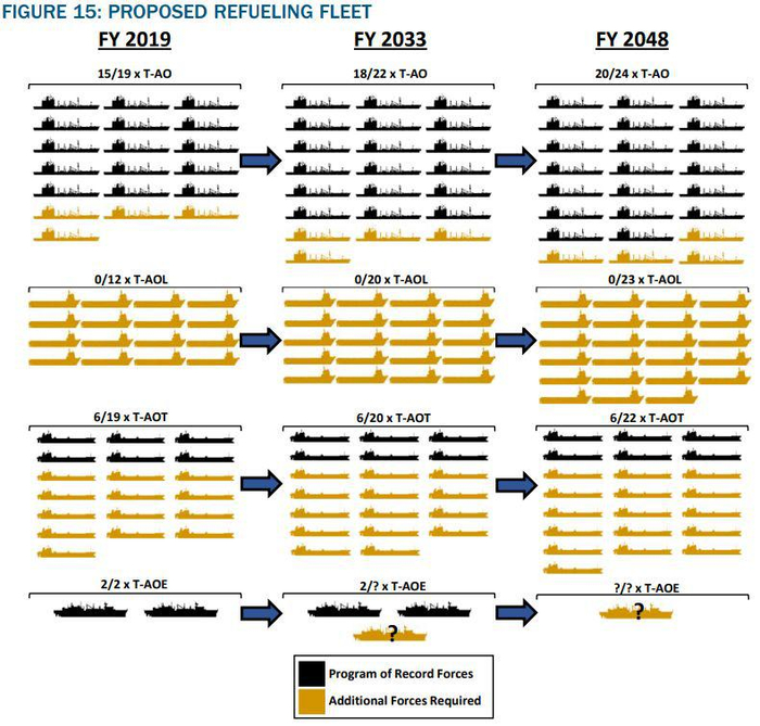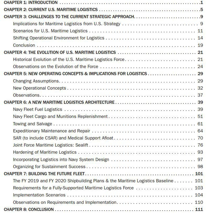 美国海军和其它军兵种已在调整当前和未来的作战部队的规模,但相应的后勤保障工作却有所滞后。海军的理念已开始强调作战区域甚至跨战区的地理泛在分布、减少对固定地点的依赖、增强部队在作战区域内遭遇攻击的应变能力,这些都要有非常得力的后勤保障。所以,报告对2019、2033、2048年海军作战部队在平时、战时的后勤保障需求进行了分析,确定了后勤能力方面的主要差距。