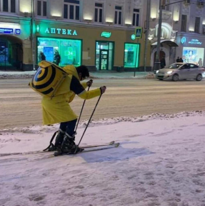 ●在冬天的俄罗斯城市滑雪前进的外卖小哥 / 网络
