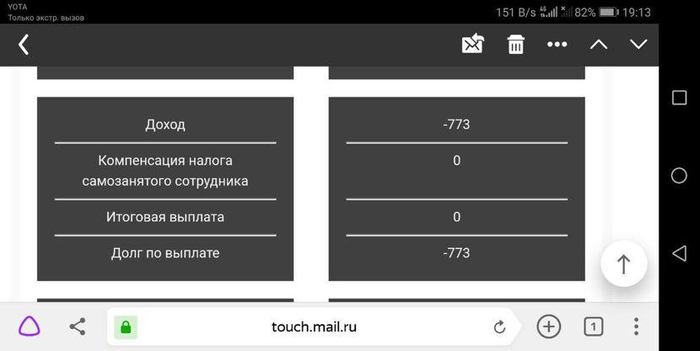 @Gipotez4在接下来的几天里又陆陆续续地公布了他收到的私信内容。在这之中,有人被要求14分钟内抵达四公里以外的目的地,并因为没有完成要求而遭到罚款,即使在导航软件的计算里,那段路程最快也需要23-24分钟;有人晒出了自己的工资单:在0次迟到、0次接单送单超时的情况下,其收入为零,并且还产生了773卢布的罚款——没有人知道原因是什么。