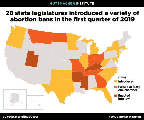 ●2019年刚过去的第一季度,就有共28个州在力推反堕胎法案/ Guttmacher Institute