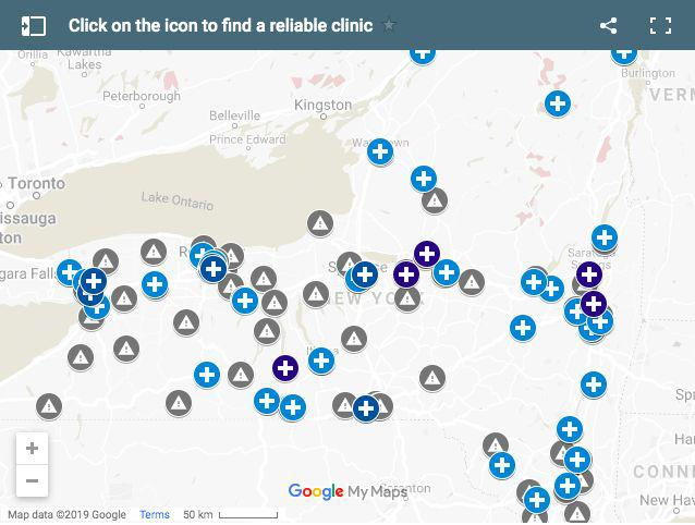 ●纽约州真假堕胎诊所的分布,加号是真的,惊叹号是假的/ The Outline