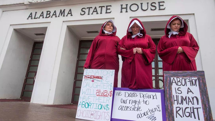 ●反对者装扮成反乌托邦电视剧《使女的故事》中的人物,在阿拉巴马州议会大厦门口抗议:“堕胎是一项人权” / AP
