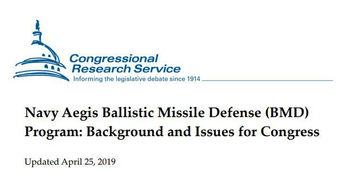 2019年4月25日,美国国会研究机构(congressional research service, CRS)向国会提交报告《海军宙斯盾弹道导弹防御项目:背景和国会面临的问题》(《Navy Aegis Ballistic Missile Defense (BMD) Program: Background andIssues for Congress》)。概述了美国宙斯盾弹道导弹防御项目最新的发展情况,并分别针对不同方面,提出潜在的监管问题。
