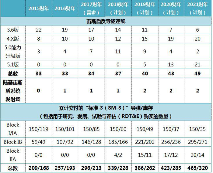 来源:关于宙斯盾反导驱逐舰数量和陆基宙斯盾发射场数量,表中数据基于2016年3月25日美国导弹防御局向美国国会调查局做汇报的简要幻灯片;关于累计交付的“标准-3(SM-3)”导弹/库存,数据来源于美国导弹防御局提交的2017财年预算请求。
