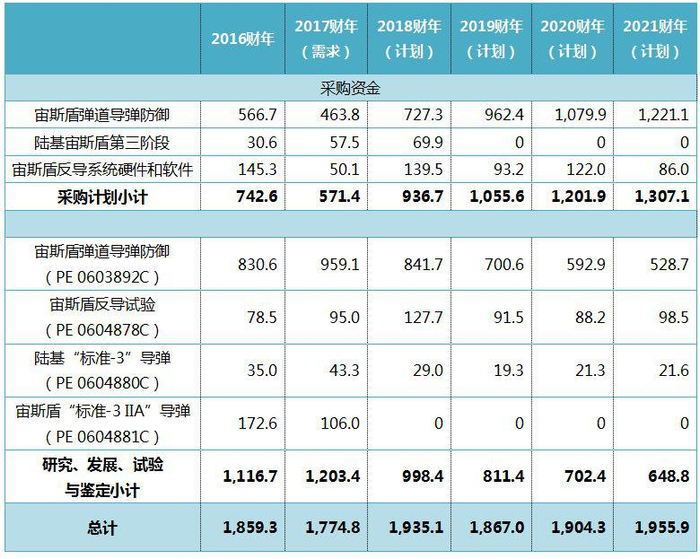 单位:百万美元,四舍五入至最接近的十分之一;由于四舍五入,总数可能不会体现相加结果。资料来源:表中数据由美国国会调查局基于美国导弹防御局提交的2017财年预算请求编制。
