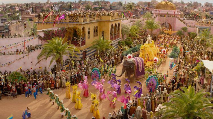 后半段主角与反派贾方争抢神灯部分,也从宫殿内延伸到了市区,加上众多士兵参与追逐、魔毯和鹦鹉的参与,这部分动作镜头贯穿了地面、空中、屋檐下等几个场景。