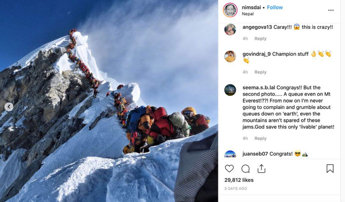 5月23日,成功登顶珠峰的尼泊尔登山者Nirmal Purja在社交媒体上发布了一张照片,引发全球关注。照片上,一个长长的队伍正拥堵在珠峰“死亡区”,这个地区一次只能过一个人。据Purja称,大约有320人堵在那里。