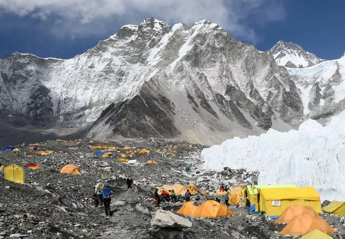 登山者和搬运工2018年4月在珠峰大本营。 PRAKASH MATHEMA/AGENCE FRANCE-PRESSE — GETTY IMAGES