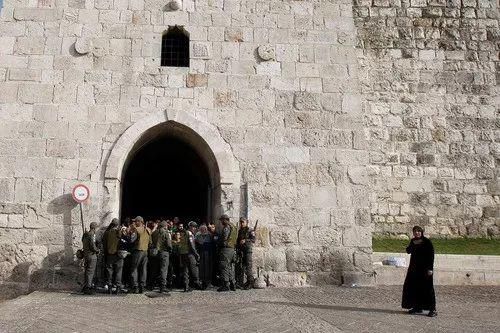 2014年5月28日,反对“耶路撒冷日”庆祝活动的巴勒斯坦人被以色列边防警察限制在耶路撒冷老城的希律门门口。新华社发(穆阿迈尔·阿瓦德摄)