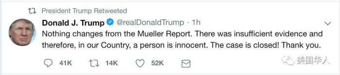 特朗普总统在穆勒讲话后第一时间发了推文:“与穆勒报告没有不同。证据不足。因此,在我们国家,这就是无辜。案子结束了!谢谢。”只是穆勒明明白白地说了,他的调查不能得出总统是无辜的结论。
