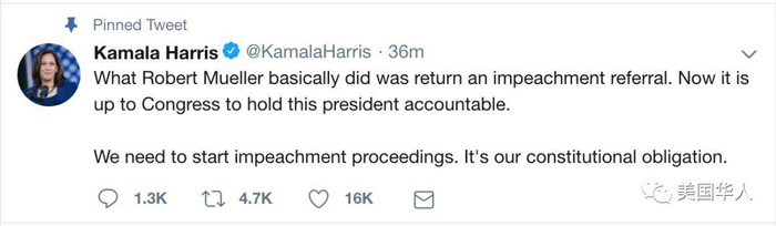 民主党2020总统竞选人Kamala Harris也发出推文:“罗伯特·穆勒基本上就是给出了一个弹劾的推荐。现在该是国会来担当起对总统的(监督)负责了。”