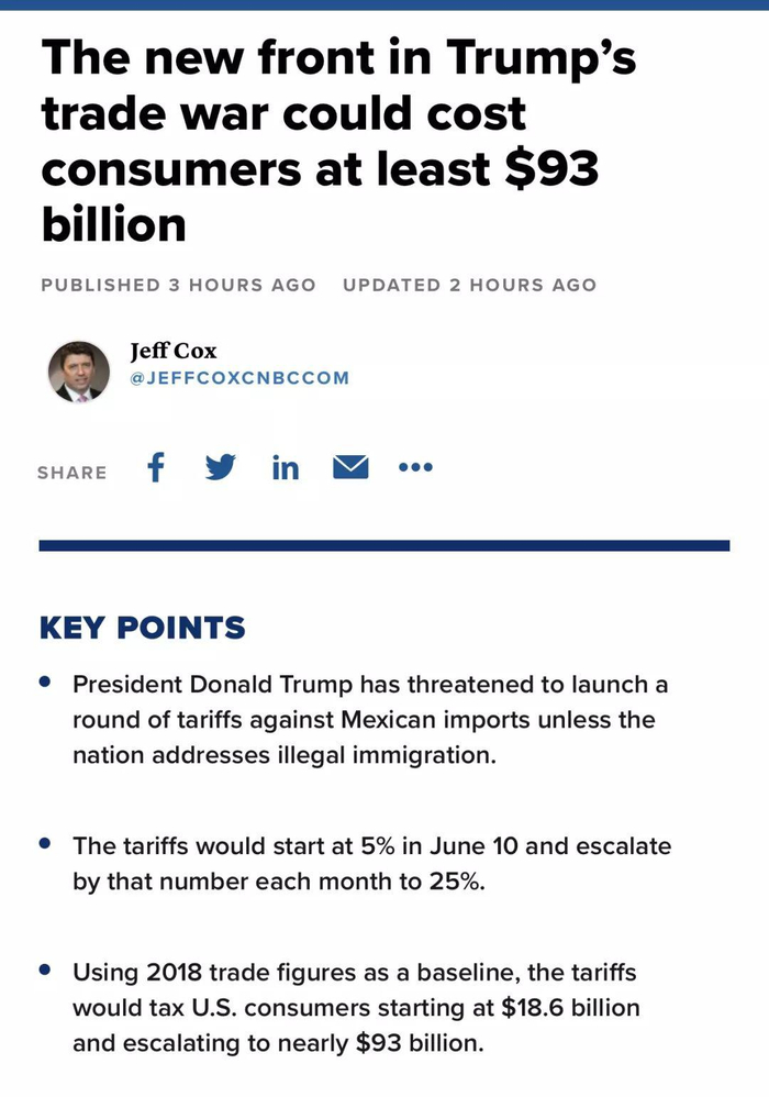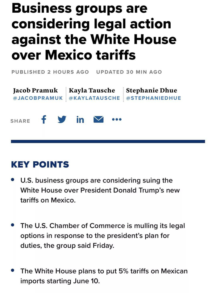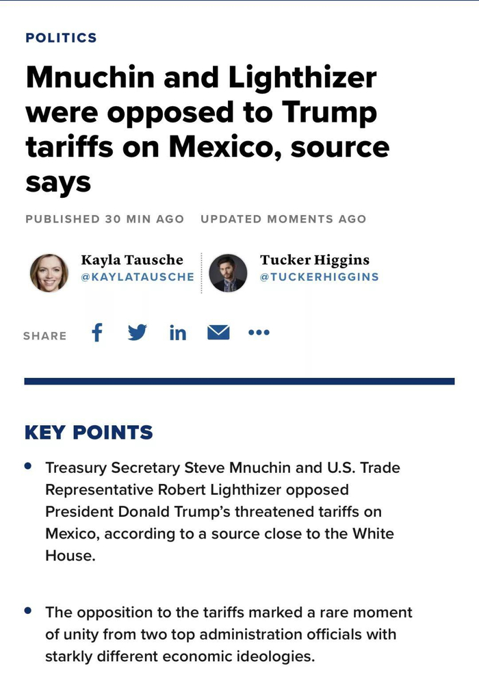 CNBC 报道称美财长和贸易代表都反对特朗普向墨西哥征关税。美墨加协议刚刚签署,国会还没确认,特朗普怎么能说反悔就翻脸呢?