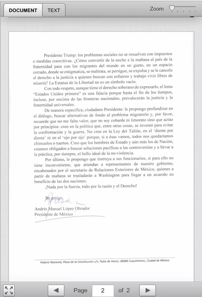 以下是墨西哥总统致特朗普的公开信