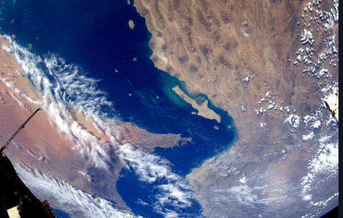 从太空中俯瞰霍尔木兹海峡,深蓝色的海水劈开土黄色的山地,将波斯湾和阿曼湾分开,如同“狮口”一般大张着。