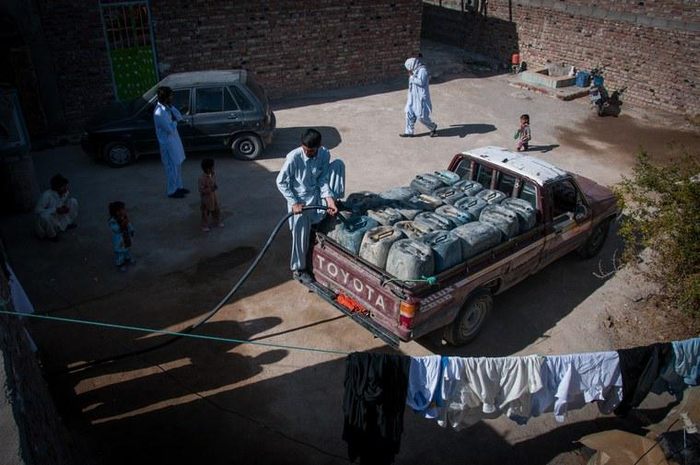 之后,这些走私者有时会以超100英里每小时的速度,在崎岖的山路上狂飙。有些人在边境放下燃料,让其他人把它装上驴子,以便在巴基斯坦山区进行更艰苦的徒步旅行。 那些想要更大利润的人,需要自己走完全程。在无法通过的路段,走私者还会徒手来着油桶前进。