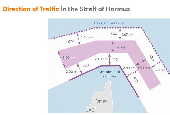 霍尔木兹海峡最窄的地方仅21英里(35公里)宽。两条航道各只有2英里宽,中间还有2英里的缓冲区域。尽管航道窄,但是深水湾也能使300多米长、60多米宽的巨型油轮(VLCC)通过。