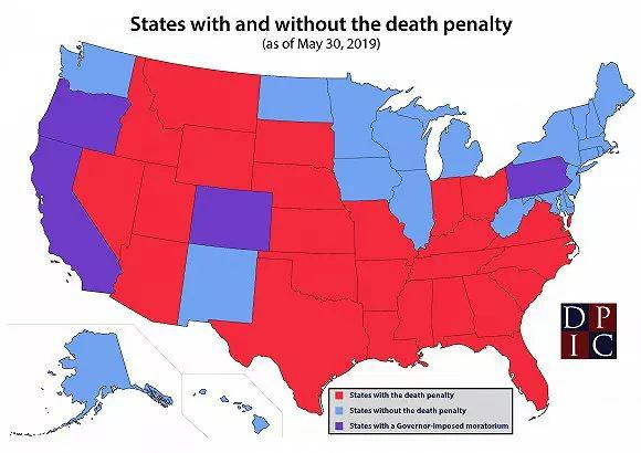 蓝色州已废除死刑,红色州保留死刑,紫色州处于暂停阶段。来源:美国死刑信息中心