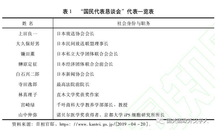 按照首相官邸网主页公布的内容,本轮年号确定的程序也是按照“组织社会贤达讨论新年号、征询两院议长意见、召开全体阁僚会议、通过改元政令、内阁官房长官发布年号、首相召开记者会发表新年号谈话”的程序执行的。2019年4月1日,来自学术、文学、法律、经济、媒体传播等五大领域的社会贤达人士组成的国民代表恳谈会(参见表1),在相当保密的状态下讨论新年号。