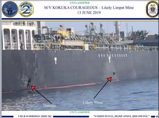 美国军方照片显示,油轮可能遭到吸附雷的破坏