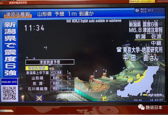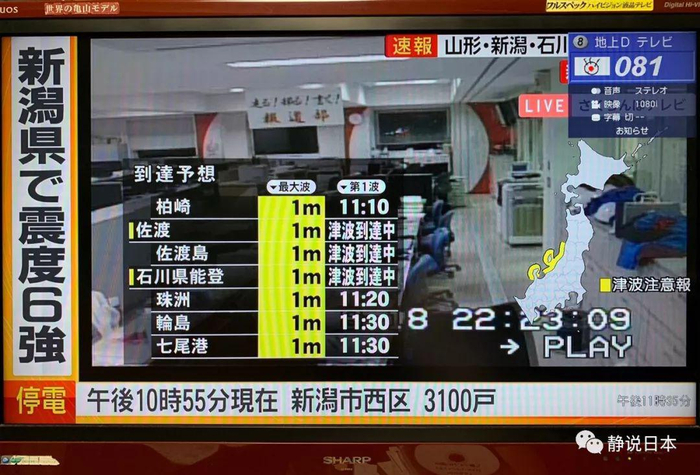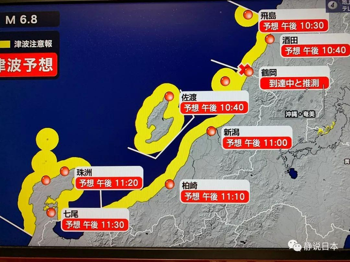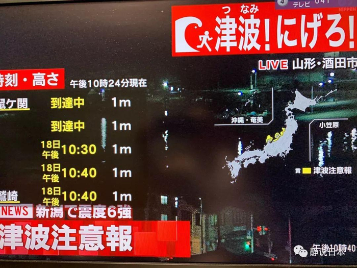 山形县海岸的6.7级地震,造成了整个东北地区的强烈震荡,震级6级的地区集中在山形县和新潟县。由于震源在海底,因此地震发生后,气象厅紧急拉响了海啸警报,并公布了海啸的预估高度(1米)、范围和抵达各地海岸的时间。