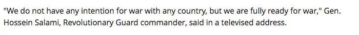 伊朗革命卫队指挥官 Hossein Salami 公开表示:“我们无意与任何国家开战,但我们也完全做好了开战的准备。”