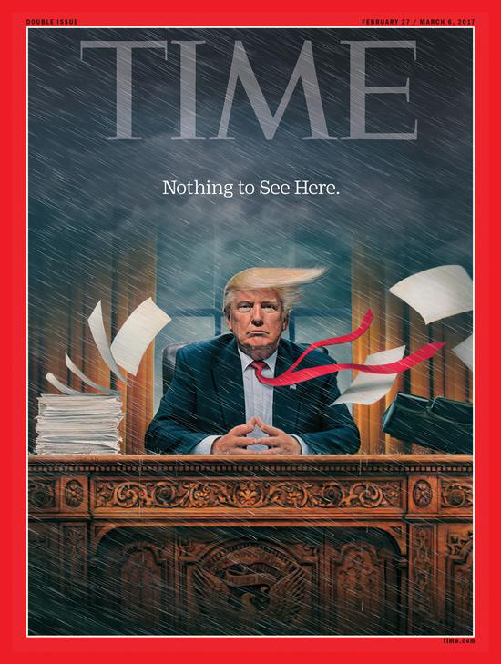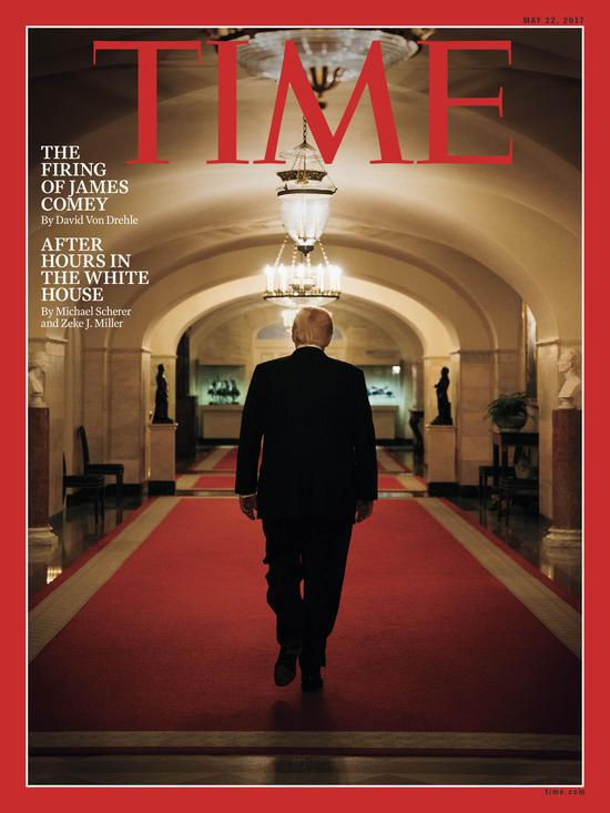 6月20日的《时代》杂志封面上,特朗普倚靠着总统书桌,目视前方。《时代》周刊的摄影师说,总统当天提前到位,让人感到有些意外。摄影指导和总统简单交流后,12分钟,封面拍摄完成。
