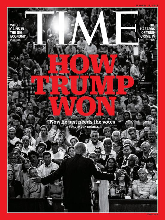2015年,26年后的6月16日,特朗普正式宣布参选总统,次年8月31日,他第二次登上《时代》封面,以“令世界大跌眼镜”的总统候选人身份。