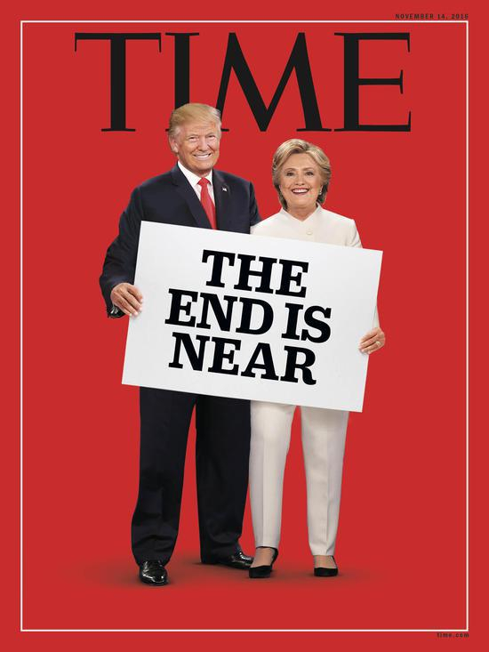 2016年11月3日,特朗普和希拉里面带微笑并排站立:结局将至(the end is near)。从竞选开始,二人隔空较劲。到了三场总统辩论,二人近距离交火:特朗普和希拉里在辩论前不握手;特朗普在台上直言若自己当选,要送希拉里进监狱…