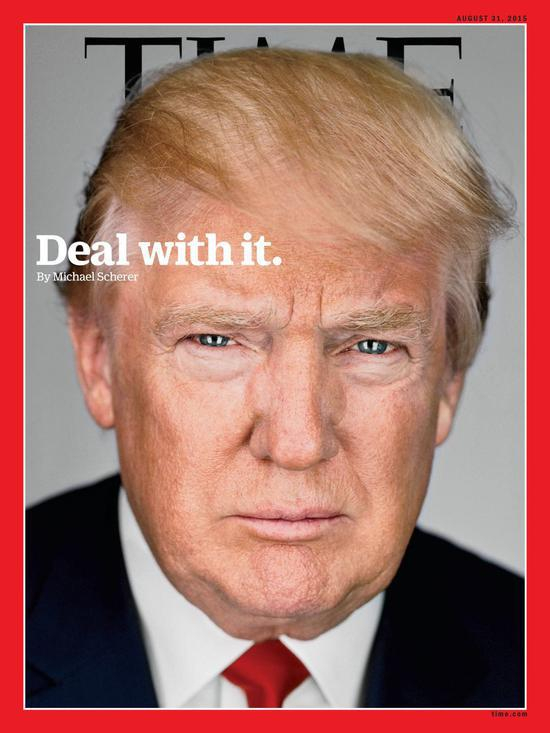 2015年8月31日,“特朗普登陆”,69岁的特朗普再次登上《时代》封面。封面上写着:deal with it。特朗普在采访中谈到了2016大选对手和如何改变美国政治。那时,特朗普宣布参选总统才两个月,几乎整个美国都把他的参选当成一个“笑话”,没有多少人看好他,甚至还流传一个段子:特朗普将成为“最后一任美国总统。
