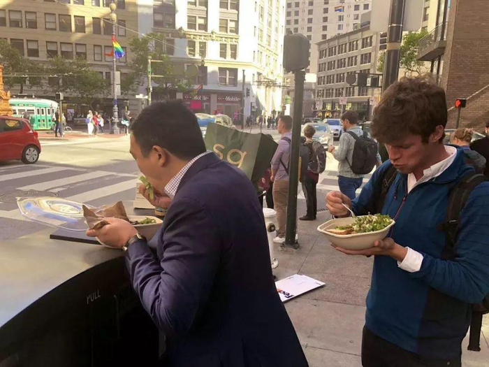 杨安泽在一次旧金山的竞选活动前在街边吃快餐。(图片来自推特)