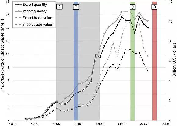 《科学进展》(Science Advances)2018年发布的报告指出,1993到2016年,全球垃圾年进口量增加了723%,出口量则增加了817%。仅2016年一年,就有123个国家出口了1410万公吨塑料垃圾用于回收利用,其中中国接收了来自43个不同国家的735万公吨塑料垃圾,占比超50%。
