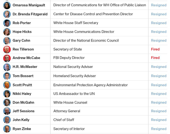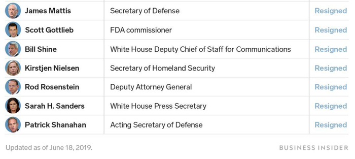 美国《商业内幕》杂志统计称,截至6月18日,特朗普政府内已有35名高级官员离职。其中包括两任国家安全顾问、两任(代理)国防部长、两任白宫办公厅主任,以及国土安全部部长、美驻联合国大使等重要职务。