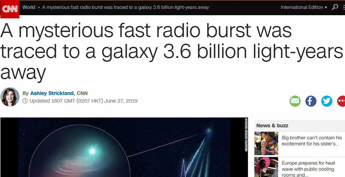 CNN报道,科学家们近日首次追踪到一个快速射电暴(FRB)的起源,是距离地球36亿光年的星系。