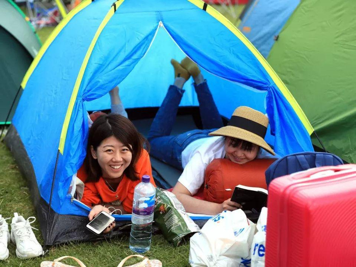 大家有各自的帐篷,帐篷里有气垫和睡袋,躺椅,弹出式桌子,食物和饮料的冷却器,还有一台直播比赛的iPad。