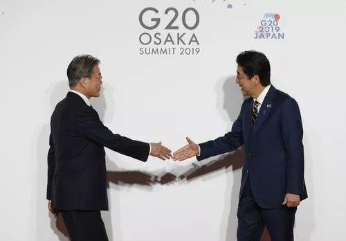 6月28日,在日本大阪,日本首相安倍晋三(右)欢迎韩国总统文在寅。新华社发