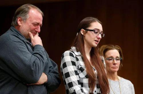 2018年2月2日,在美国密歇根州夏洛特市,受害者凯蒂·布莱克(中)在父亲和教练的陪同下出席听证会。新华社/路透